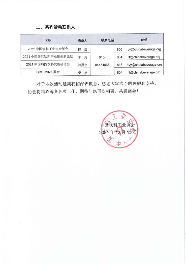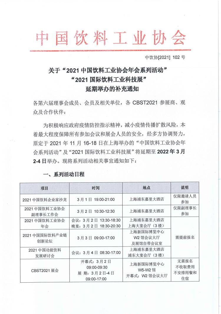 鑒于近期國(guó)內(nèi)多個(gè)地區(qū)以及上海新冠肺炎疫情的突發(fā)情況,按照上海市防疫要求,原定于2022年3月24-26日在上海舉辦的“CBST2021中國(guó)國(guó)際飲料工業(yè)科技展”將暫緩舉辦。如有新的進(jìn)展將盡快公告。